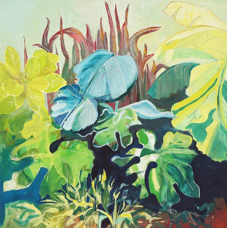 'Bodham Bananas' is inspired by tropical foliage and giant banana trees that have (rather worryingly) flourished in my North Norfolk Coastal garden, although I do wrap them in the winter. This is one of my first oil paintings. Painted onto hardboard primed with household paint.