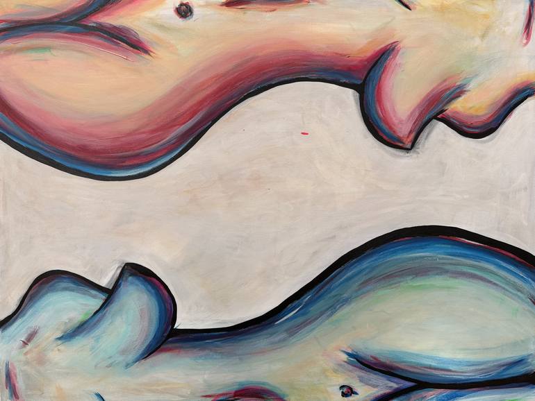 This abstract painting grew from an intuitive process, guided by movement and feeling rather than a fixed plan. Curving, organic forms stretch and lean toward one another, outlined with confident lines that suggest both separation and connection. Shifts between warm and cool color create a quiet ten...