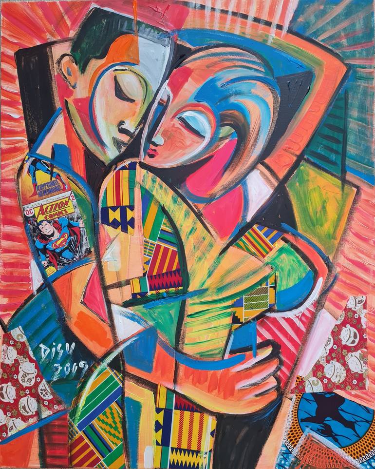 Dada Adesoji Disu a.k.a. “DISU”. Born in 1968, On the Island of Lagos,Lagos state,Western Nigeria.He attended school of Art and Design Auchi Polytechnic and Telford college of art and technology,England. United KingdomHe was resident Artist National Gallery of Art Nigeria from 1997-2001.A former fine art teacher with Chalawa Secondary School,Kaduna State,Northern Nigeria. Member of Southwark art forum England.He has had numerious private and Public art commissions back home in Nigeria( He was more a Community Artist in Nigeria) and had several group exihibitions ever since arriving in the United kingdom.His Works are in private collections in Nigeria,Qatar,South Africa,U.S.A, Denmark, Canada, United Kingdom,Germany. He is a multi media artist. Also, his works are influenced by his African yoruba background which is mostly decorative, heavily patterned motifs and colourful tend to neutralise dominating gray surroundings. There is empharsizes on head ( Ori- Destiny).The size of the head is the artistic visual interpretation of what the future holds. In Yoruba culture and belief system , head is where authority and reasoning come from,therefore,your success in life depend on how you make good or bad use of your head.The head is considered bigger than the rest of the body because is essence of man. Therefore the burden it bears makes it bigger.Our heads constituting our life-source and controlling personality and destiny. Three different modes of representing the head are identified in Yoruba aesthetics : the naturalistic, which refers to the external, or physical, head (orí òde); the stylized, which hints at the inner, or spiritual, head (orí inú); and the abstract, which symbolizes the primeval material (òkè ìpòrí) of which the inner head was made. Although the fate of each individual is believed to have been predetermined in heaven before birth "into" the earth, a good or bad destiny is no more than a potentiality for success or falure; a successful life depends on how well one makes use of one's head here on earth. The prominence given to the head in Yoruba aesthetics is thus a reflection of its sociobiological importance as the coordinating center of human existential struggles. His recent project which was conceived and curated by Phil Growick.the author of “The secret journal of Dr Watson”, is a book cover for Sherlock Holmes novel entitled: The strange Case of Violin Savant by Gregg Rosenquist.