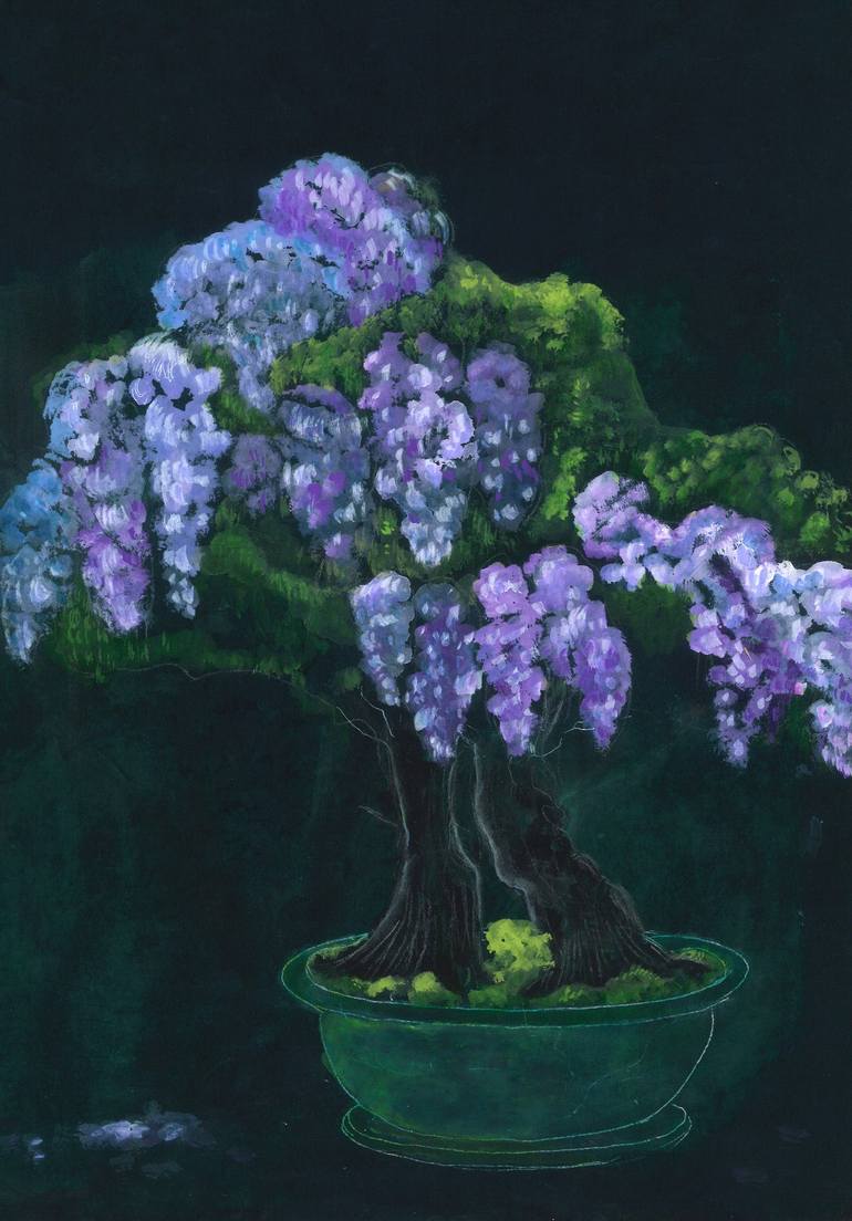 Dibujo de un bonsái de estilo impressionism. Tinta y couache sobre papel japonés de gampi