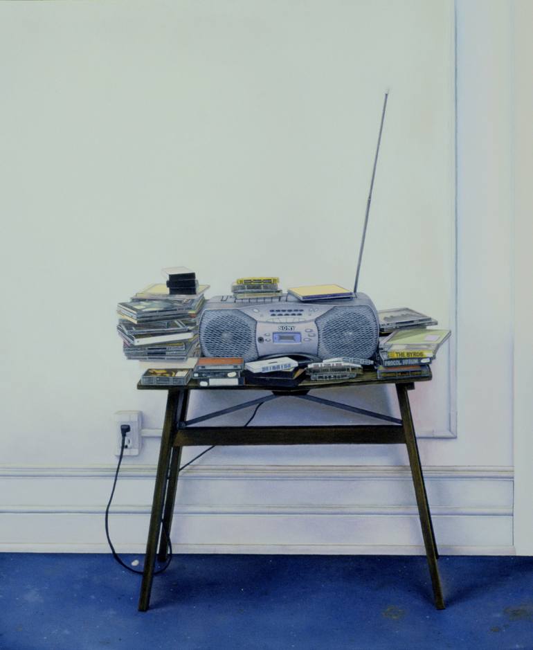 This is one of an ongoing series of paintings exploring the convention of still life painting. This is a painting of my old studio radio and the music I was listening to at the time. The CDs, tapes and antenna represent the potential of sound that cannot be fulfilled. What is left is silence. The sp...