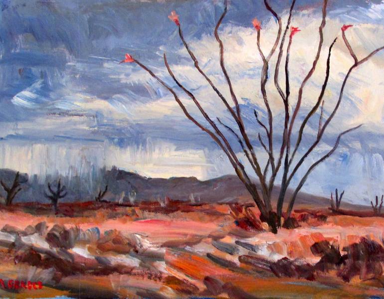 The parched, dry desert floor is relieved by a drenching summer rain storm. The Anza-Borrego desert is a day trip from San Diego California. It lies below sea level and many exotic plants grow there including the ocotillo with its red blooms. The original 11 X 14 inch oil painting is on stretched c...