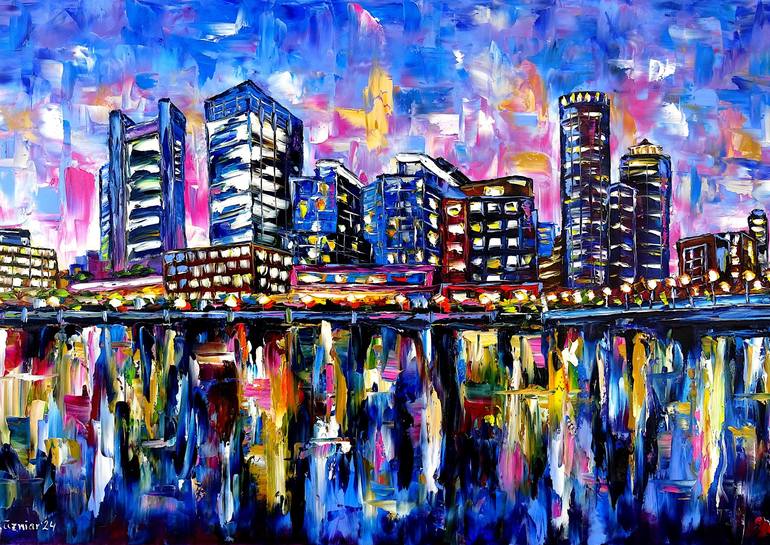 Abstract evening sky over Boston Harbor. A vibrant cityscape features towering skyscrapers with glowing windows reflected in the water below. Bold, colorful palette knife strokes create a dynamic skyline against an evening sky. Oil painting on canvas using palette knife technique, signed front and ...