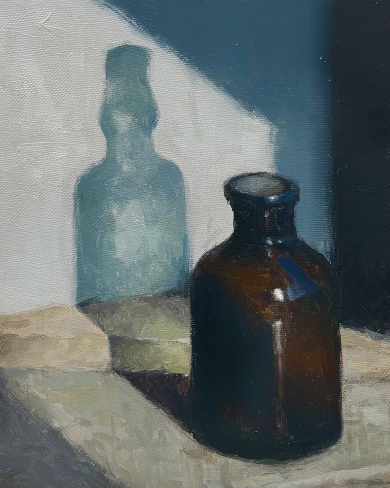 A simple yet confusing still life. Simple because the subject is very plain and subtle. Complex because the point of focus encapsulates the bit awkward shadow which not matches but is not figured out at first instance by all. Produced from a self clicked photograph with another bottle providing the ...