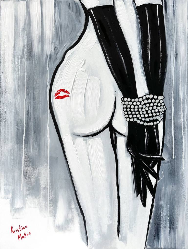 In this sensual and erotic painting, I explore the captivating interplay between control and surrender. The nude female body is depicted in a monochromatic palette — with an emphasis on the woman’s buttocks, hips, and slender legs. Her hands, adorned with elegant black gloves, are bound not by force...
