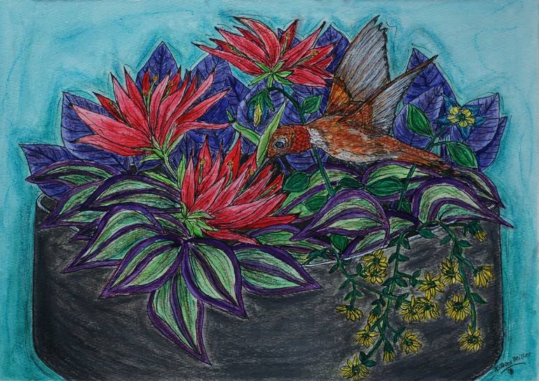 I enjoy doing a still life from time to time, and often add a hummingbird or butterfly. I like the way that adds some extra life to it. These are done in a more illustrative style with a lot of color and line work. This is shipped unframed. It has UV protectant on it as part of the process I use.