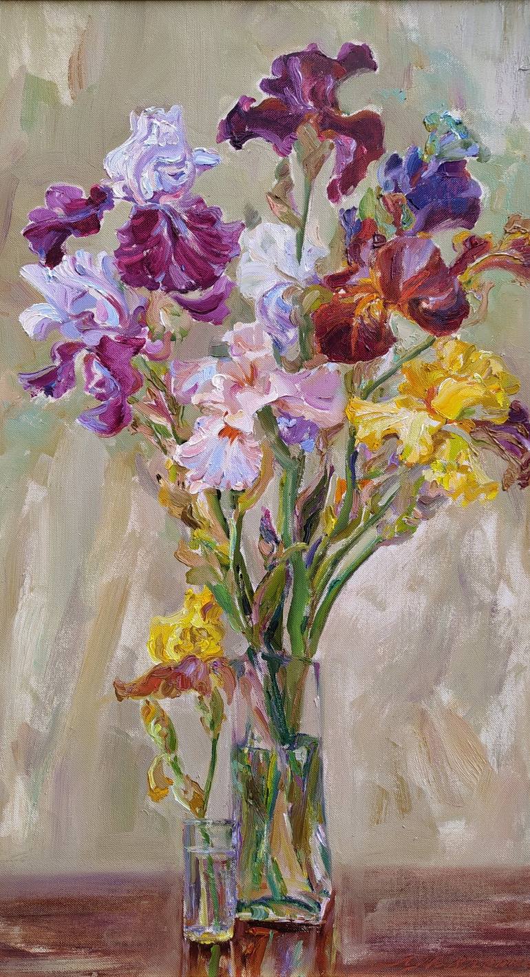 Very colorful, spring painting with a bouquet of delicate irises. Will delight you every day! Will be a wonderful gift for a beautiful lady - a bouquet that will never fade!