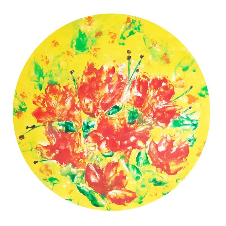In honor of this painting, I wrote a poem in my native language: • Цветы, как звезды, нас дурманят И красотой своею манят. И под покровом темноты Дарите женщинам цветы! • This round painting is dedicated to everyone who loves floral paintings. Abstract bright flowers will become the focus of your a...