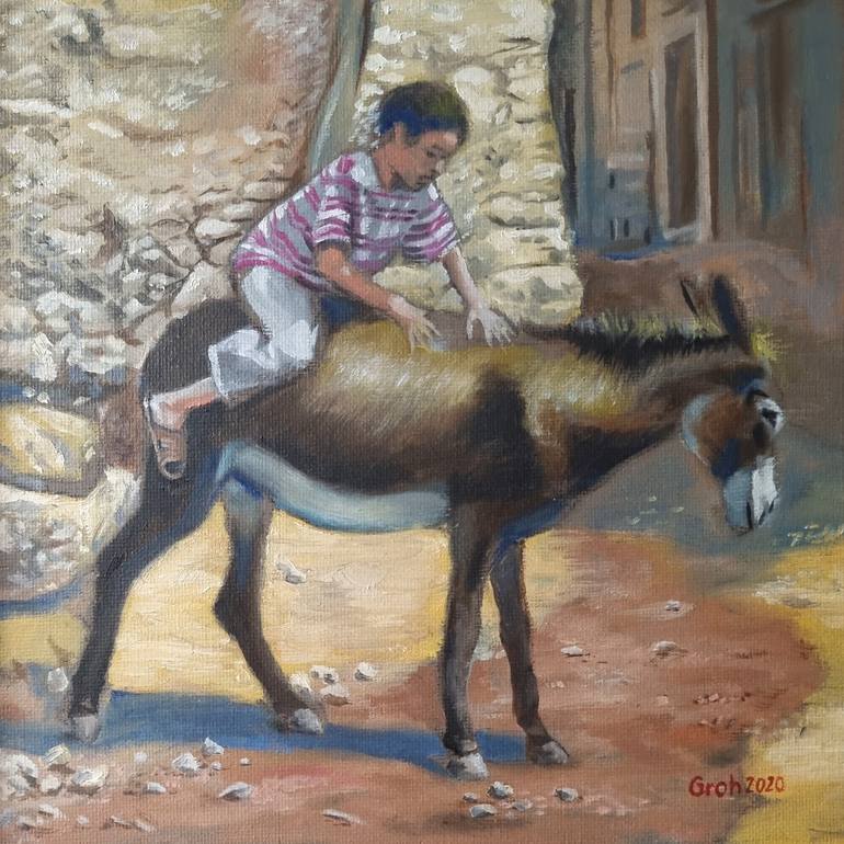 A boy in a striped t-shirt rides a donkey in a town in Morocco. The picture has an oriental ambience with its brown and beige earth tones and the oriental motif. With its fine precise details, this oil painting looks very realistic and classic. The cardboard is connected to a black floating frame th...