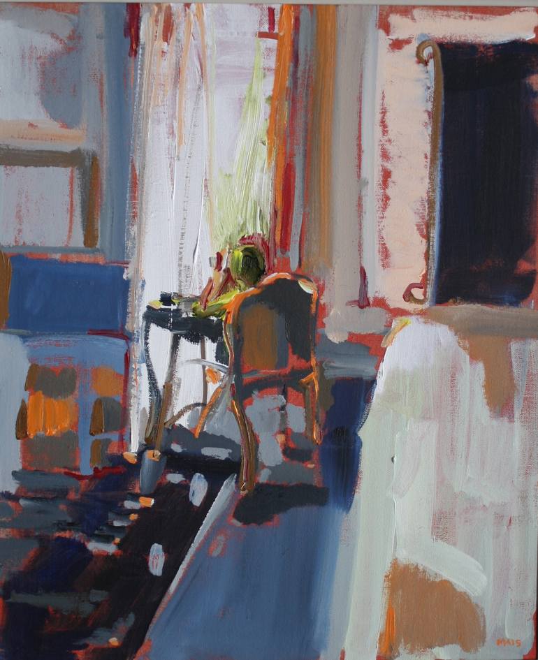 My son Will looked so relaxed on our holiday in France writing a story I just had to paint him with the light streaming in through the immense windows. The relaxed, carefree moment was a wonderful feeling and I hope viewers can recall similar times.