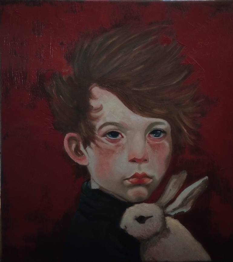 boy/ oil/ canvas on cardboard, realism rabbit toy wind protective concerned
