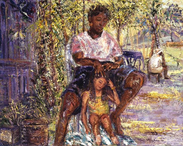 This painting is not framed and is wired in the back for hanging. I was inspired to paint this idea, based on one of my trips to the Bahamas for vacation. Here I depict my daughter getting a hair procedure at the hotel with a special braiding style called cornrows. Oil on canvas has always been m...