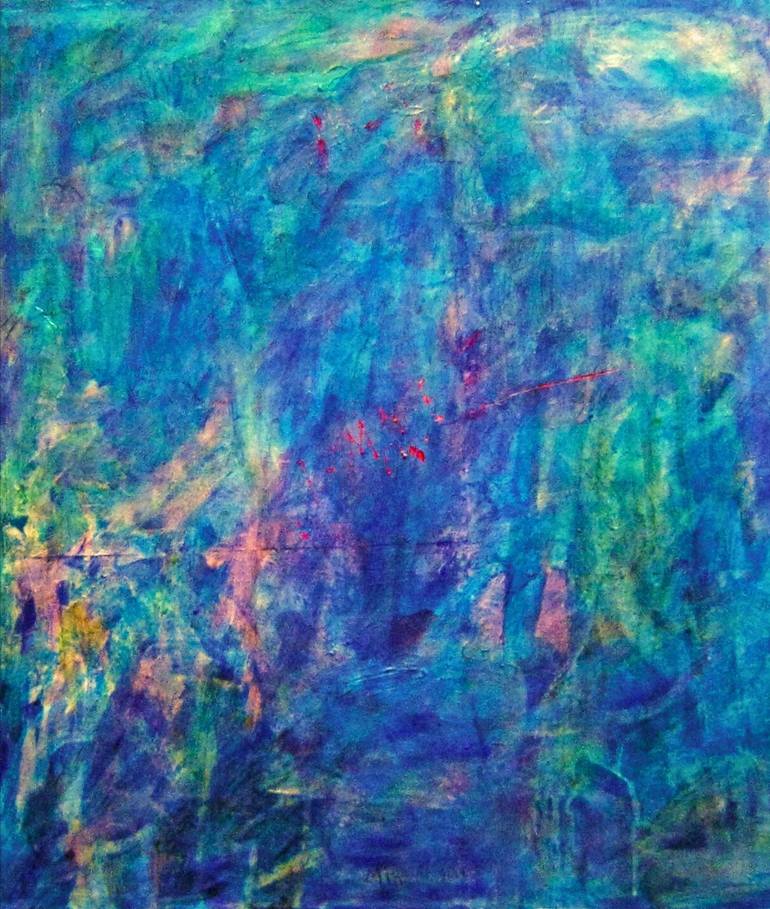'' Trying to paint something we can't see...kind of inner self portrait'' The painting appears to be an abstract piece, dominated by shades of blue with hints of green, purple, and small areas of red. Here are some observations and interpretations: Color Palette: Blues and Greens: The predominant...