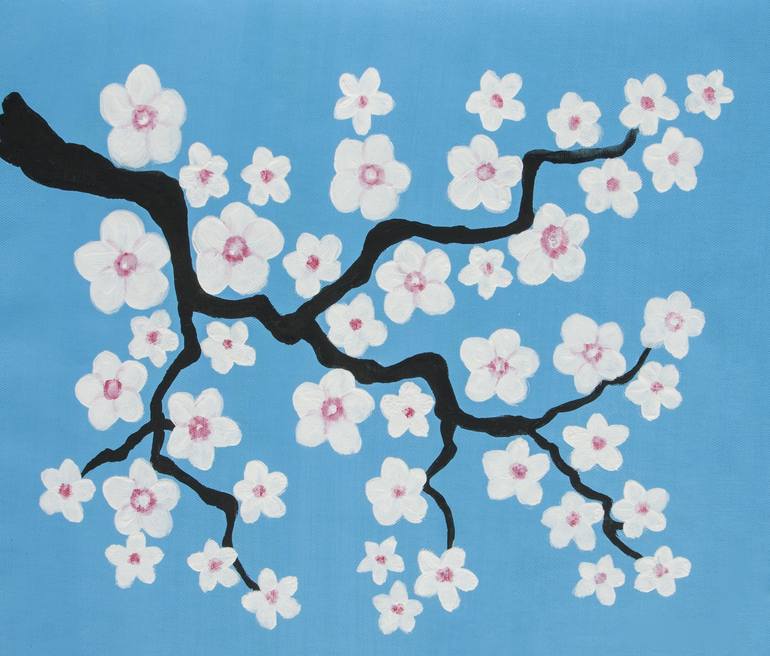 Branch with white cherry flowers on blue background. Acrylic painting on unstreched canvas without wooden frame, ships in a tube. Frame for this picture must be 2-3 sm less than canvas on both sides to have space to connect to frame. This picture is a part of seria of pictures with spring flowers ...