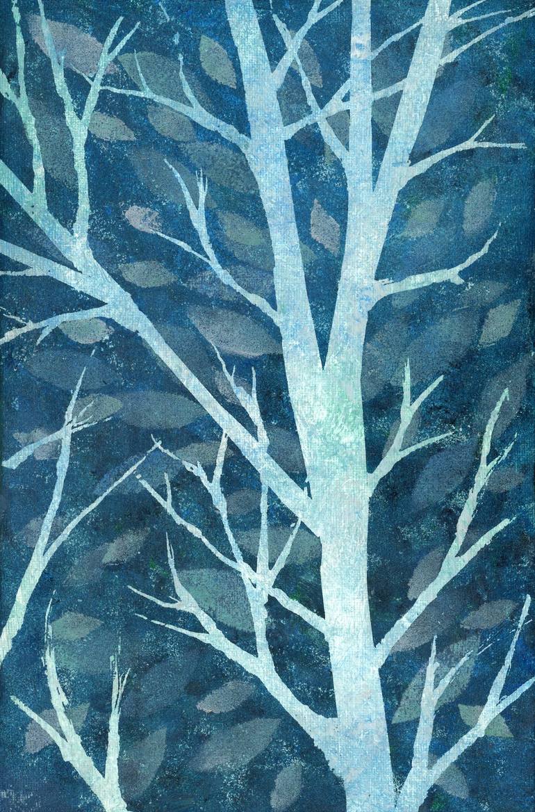 In this acrylic painting on stretched canvas, iridescent branches and leaves are silhouetted against a serene blue night sky. The shimmering, metallic textures of the trees contrast beautifully with the soft, tranquil background, creating a dynamic interplay of form and light. The piece comes ready ...