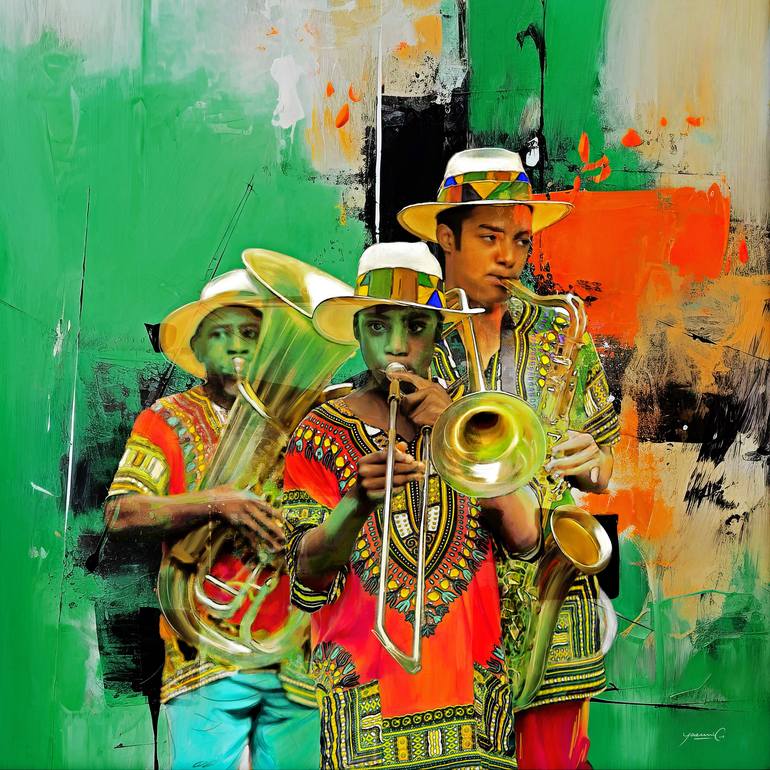 This vibrant painting captures the energy of a brass trio, dressed in colorful traditional attire, playing their instruments with intense focus. Their hats and clothing feature bright patterns that mirror the bold, abstract background of orange, green, and black, creating a lively fusion of music an...