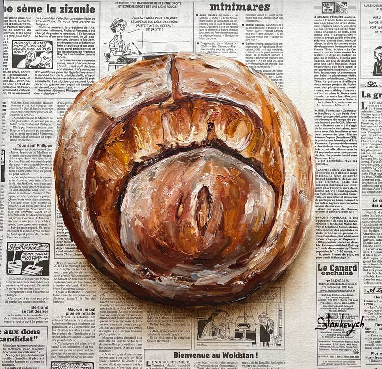 Bread by Julia Stankevych oil on newspaper canvas 16x16" (40x40 cm)