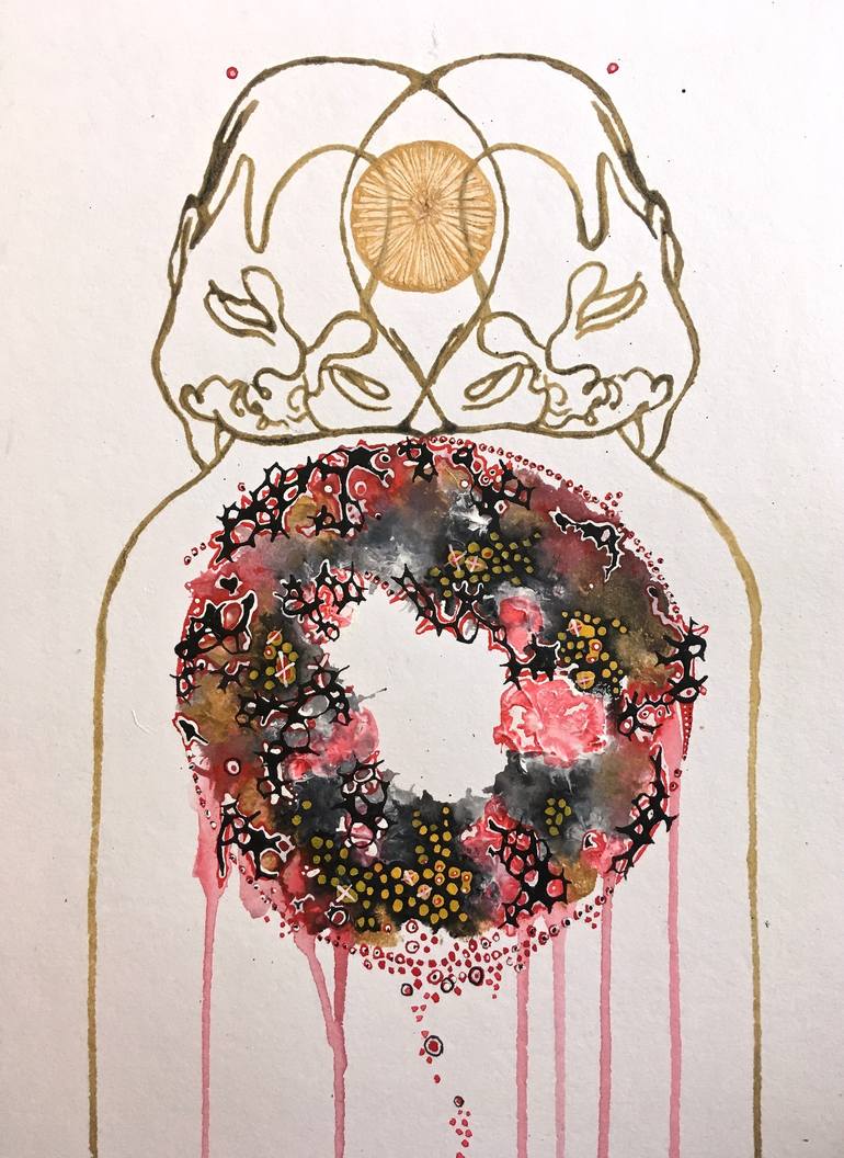 This is a painting worked from sketches made whilst breast feeding identical twins. Symmetry and figurative ink drawings are laid alongside more organic abstracted symbols in paint. The past meeting the present. These work as meditative pieces and hold magic for those they touch. Hand made Oak gall...