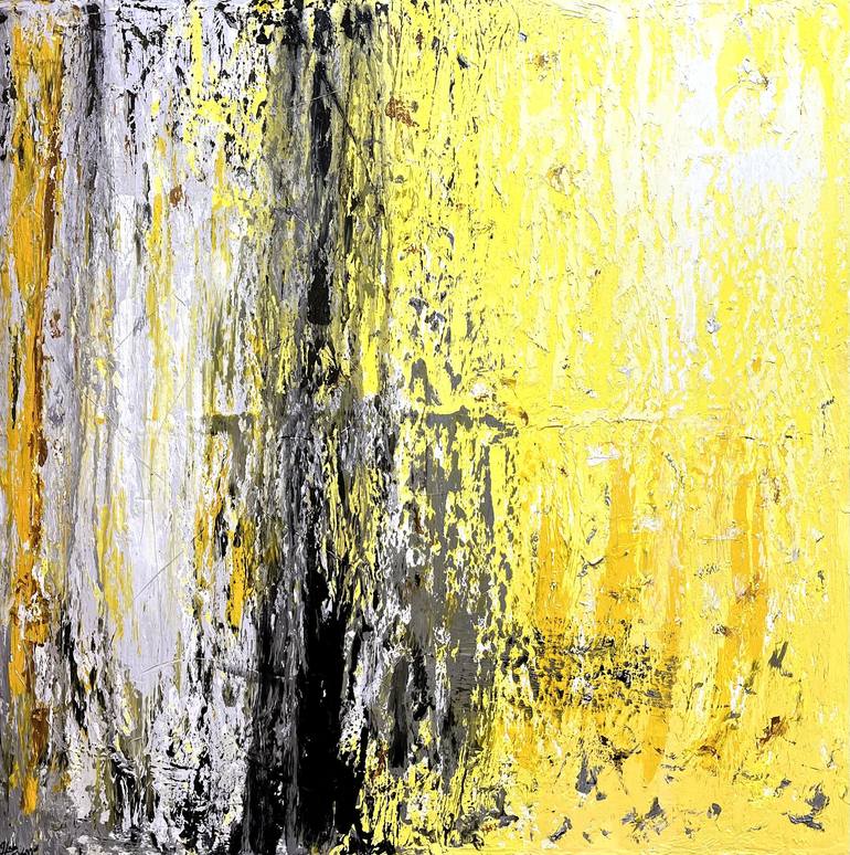 Breathing" is a stunning abstract painting that captures the essence of movement and energy. The bright, sunny yellow hues of the piece are perfectly complemented by the striking black lines and subtle gray accents, creating a unique and dynamic visual experience. The mixed media used in this painti...
