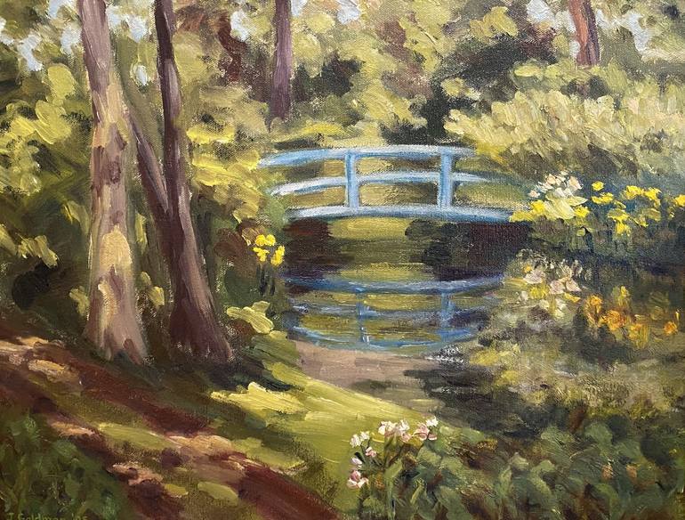 I painted this “en plein air” at a local arboretum. It featured a bridge over a lily pad pond. The bridge was not particularly attractive, so from my memory, I created a bridge similar to the one that Monet painted in his celebrated works. Fortunately, I recalled Monet’s bridge, and was able to c...