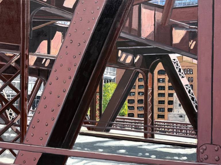 Experience the vibrant energy of a summer's day with "Bridge (close up)," an original oil painting that captures the essence of urban architecture. The sunlight filters through the intricate structure, creating a bright and inviting atmosphere. This piece is a modern interpretation of city life, rem...