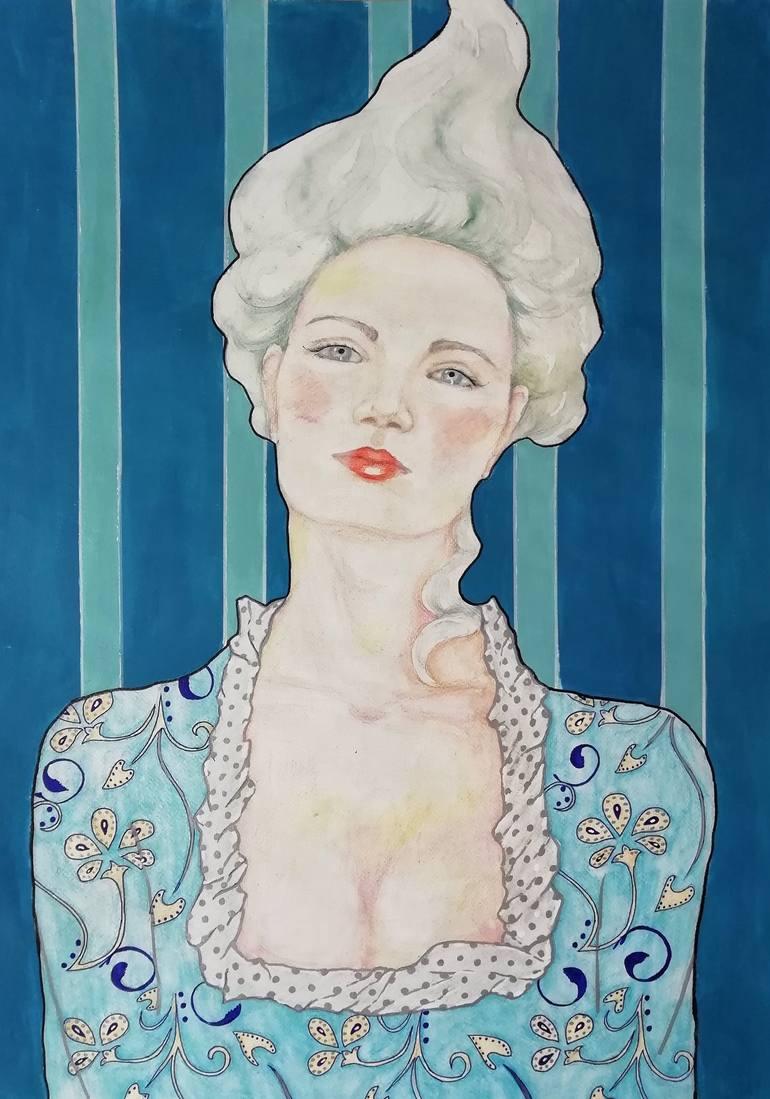 Bridget-Sophie-Christine is painted with watercolor and mixed technique on high quality cardboard. The picture is a female figure with a colored garment whose style resembles ar nouveau and ar deco. The picture is not framed, but it would stay well in any passepartout and frame.