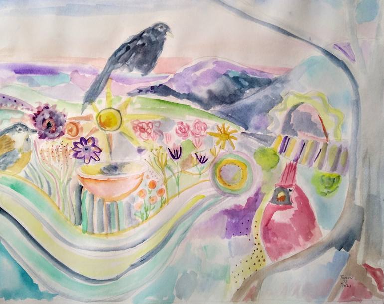 Taking my watercolor alittle bigger today. Three friendly birds I have here in New Hamphire, USA.