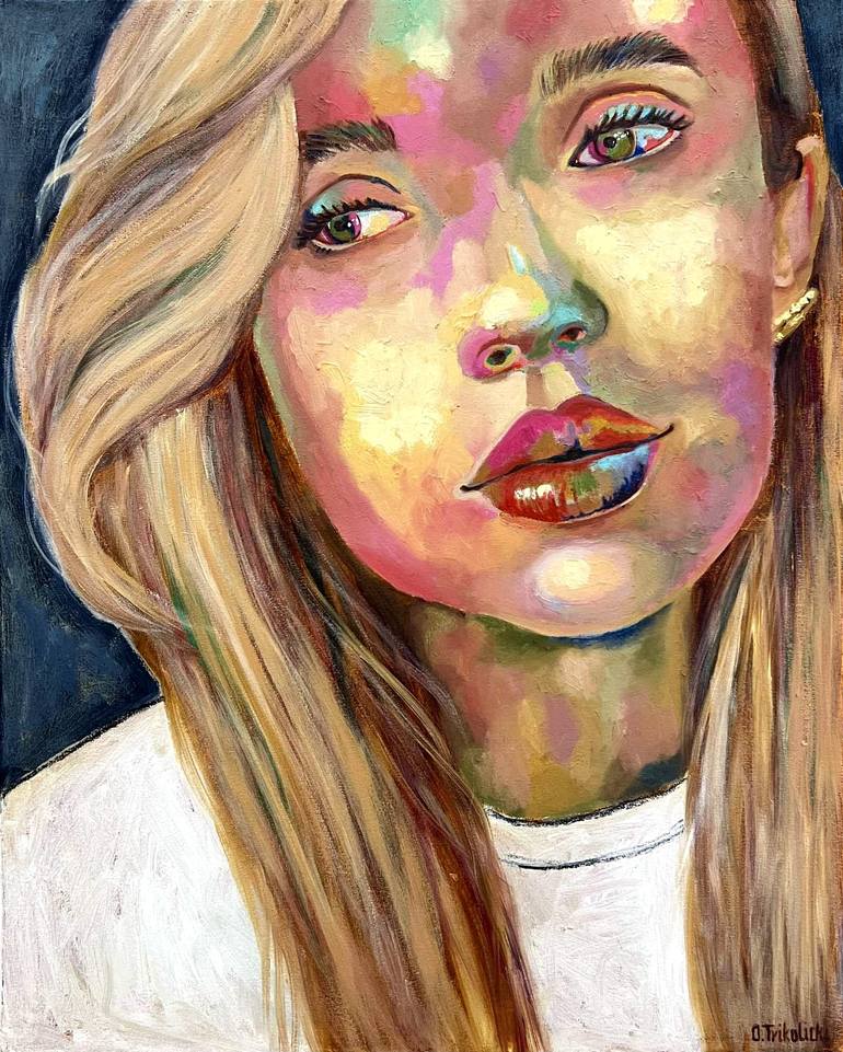 My name is Olha Trykolich. I am a Ukrainian artist. I started my creative way with a very traditional approach to art but soon switched to exploring the possibilities and depth of different techniques. Art is a process, the long way matters too. And when you love what you are doing, the rough spots are worth it. Today I create a variety of pictures, including large and small formats on canvas, panel, or paper. My main mediums are oil and acrylic paints. However, I like to experiment with different tools and themes and never get hung up on one particular material or technique. Through my paintings, I convey my feelings about the new reality and the changing world around us. During the Coronavirus, when we were all shut down at home, I felt the need to paint a series of works on the theme of limited communication, loneliness, and vaccination. At the same time, I began to explore the topic of identity, each person's connection to family, and the memory of our ancestors' history to build a harmonious future. With the outbreak of war in Ukraine, I am trying to convey the huge power of the world's resistance to evil. I see the beauty of each person's struggle for freedom. These experiences were necessary to find a connection between the several areas of my work: painting, collage, and pop-art. Each painting is an individual story that is born spontaneously, along with the spiral of time.