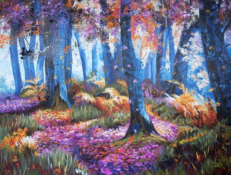 Idealistic forest in Autumn/Fall when leaves of many colours tumble to the forest floor. This is a pure emphasis on colour to icon this time of year with exaggerated hues. All edges are painted and the canvas is ready to hang without a frame.