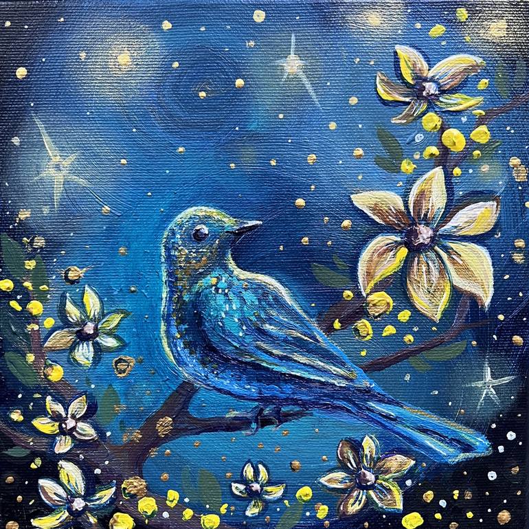 "Bright night " - Blue bird in the flowers - hand painted with acrylic paint on high quality linen stretched canvas. Beautiful textures. Bright accent in interior . Impressionistic painting. Each painting is unique and will be created specially for you. All art is handmade! Certificate of Authentic...