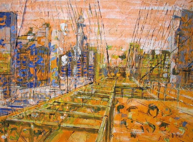My favorite Bridge is New York is the Brooklyn Bridge. First I painted it on a triangle Canvas with the rivets construction, than I painted it with oil on an handmade orange paper, than put it on canvas with some white around, this looks amazing. In between abstraction, feeling, and flying I realize...