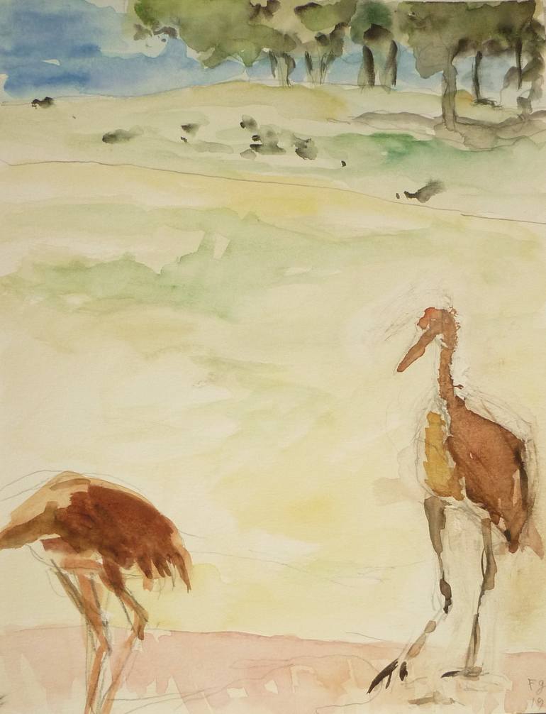 We were on vacation in Indiana and these large brown sandhill cranes came all the way up to the lodge at Pokegon where they keep feeders. They were so huge and the color of the cranes was so rich and unusual for me. The watercolor is from a photograph from that day.
