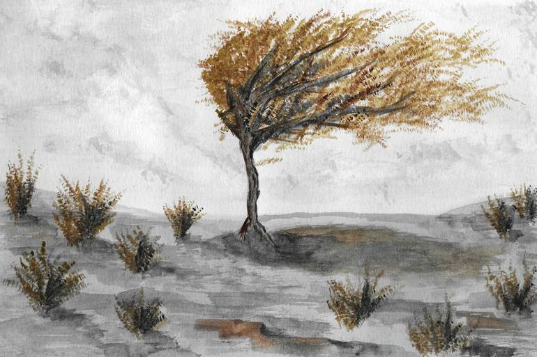 watercolour painting of a fantasy enchanted tree in the Autumn (Fall) surrounded by a bleak landscape. The images is on A4 Paper, the image size is 7.12 x 10.31 inches. The images is painted with watercolours on 250gsm paper. the image will be shipped as per Saatchi Guidelines.