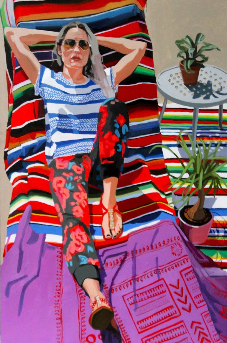 I created this piece for my solo exhibition, Portraits Patterns Plants. I created a setting for each painting using highly patterned textiles. The patterns clash and overlap, but the figure provides a focal point.