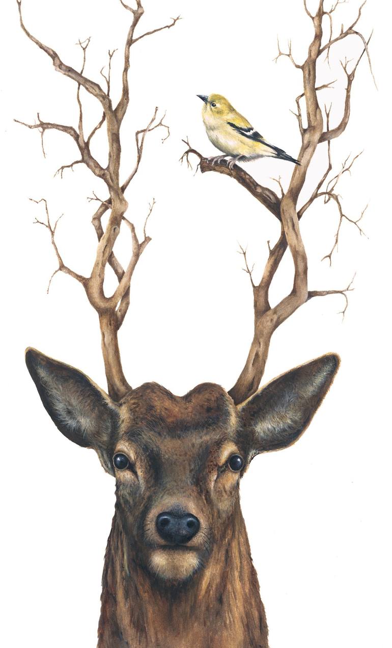 I live on a 70-acre piece of property in Vermont and have a view of a field outside my studio window. We often have deer grazing as well as a lot of birds. I see them together in my mind, giving one another solace and protection. I brought these two elements together in this painting.