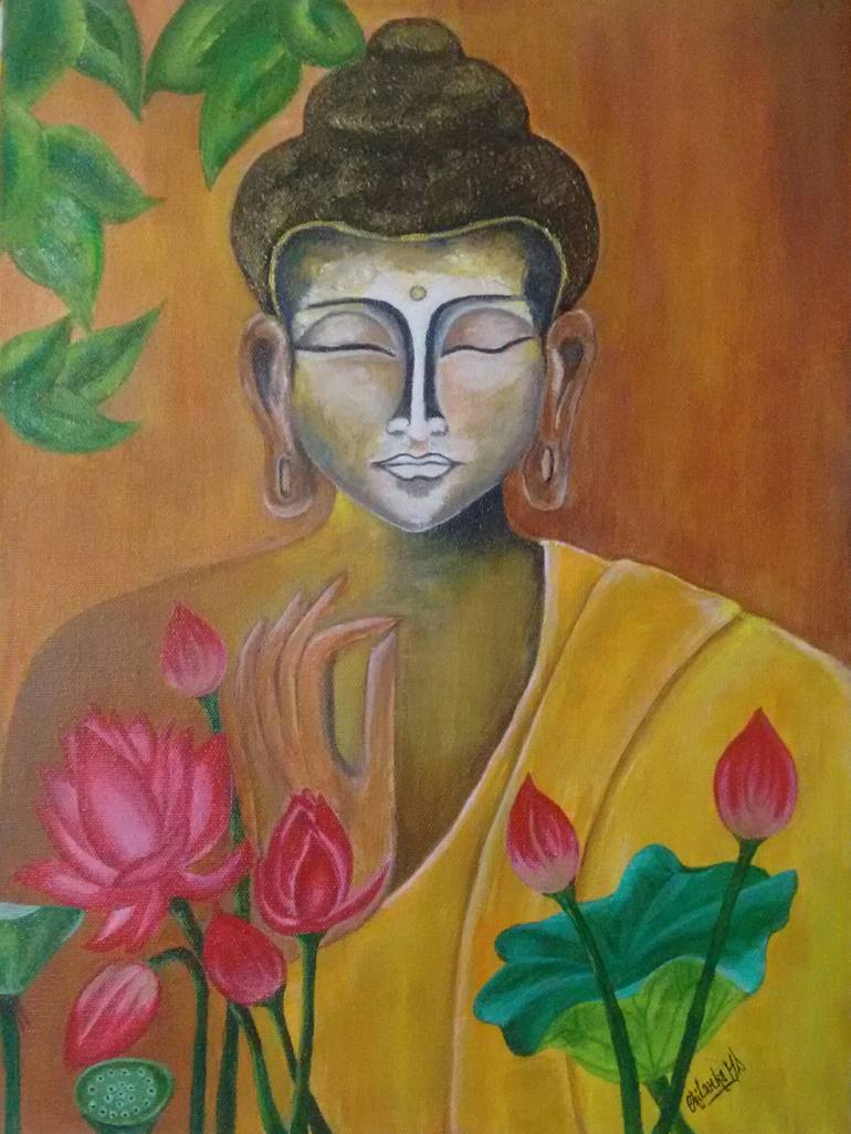 I started with this artwork as an impulse,but it took me around 1.5 months to complete.I gave myself time ,so that it would be a peaceful meditation artwork.The lotuses represent the purity. This artwork is done on a canvas board of size 12"x16" using acrylic colours.Its not framed.