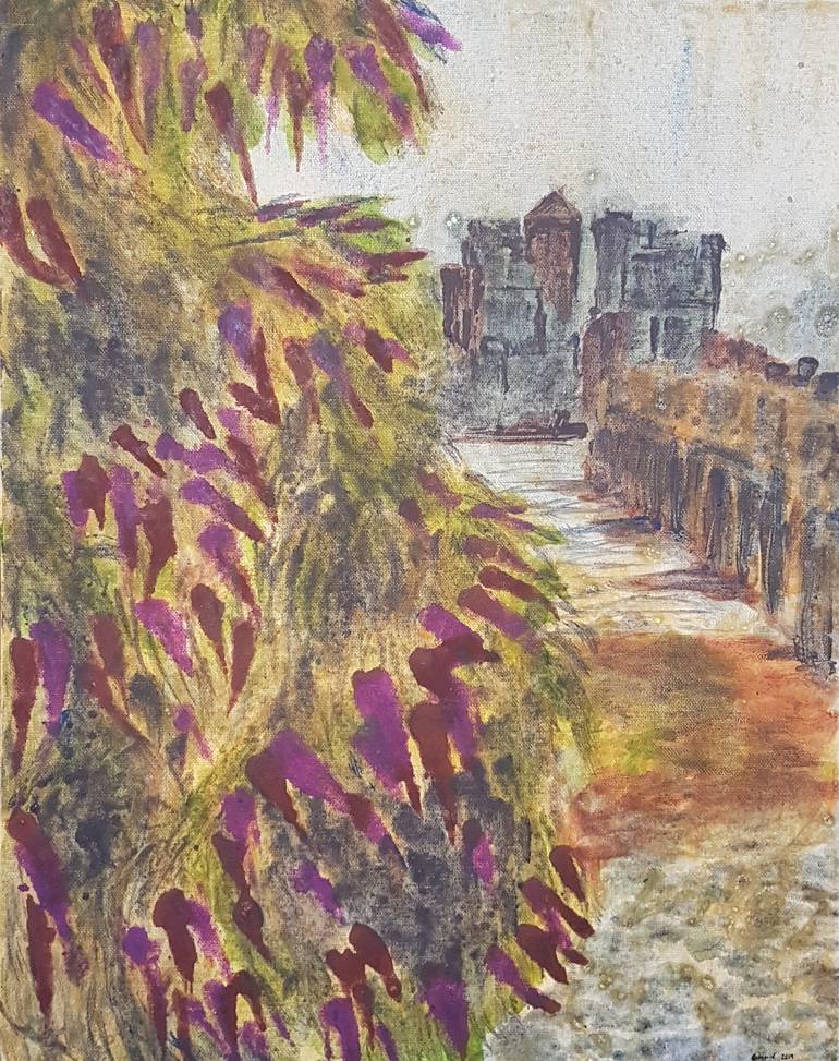 A scene looking out at Canary Wharf from across the River Thames on a rainy autumnal day. The view is dominated and almost obscured by a towering Buddleia, an invasive yet beautiful plant that is slowly taking over London waysides.