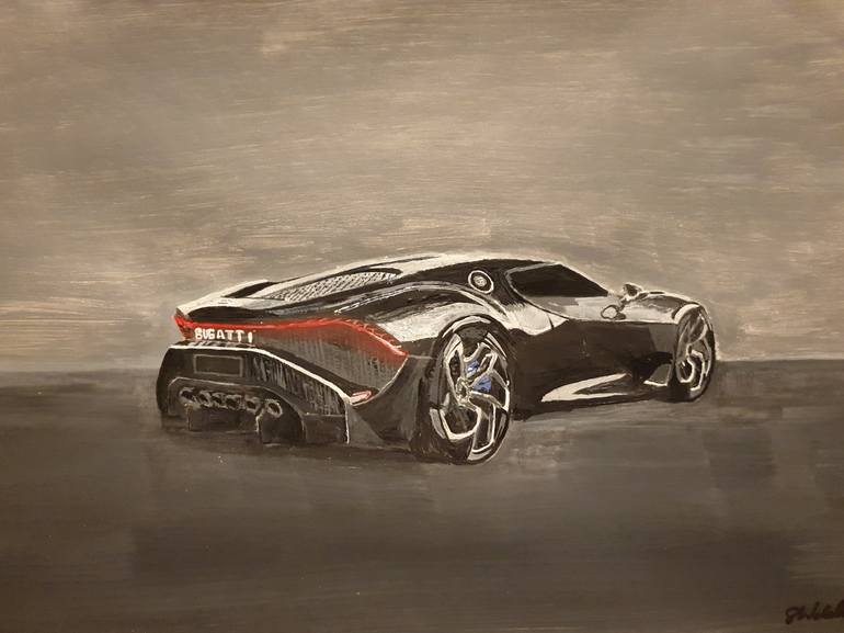 This is an acerylic on canvas of the Bugatti la Voiture Noire from the rear aspect. Launched in 2019 as the most expensive production car and the most exclusive as a one off.