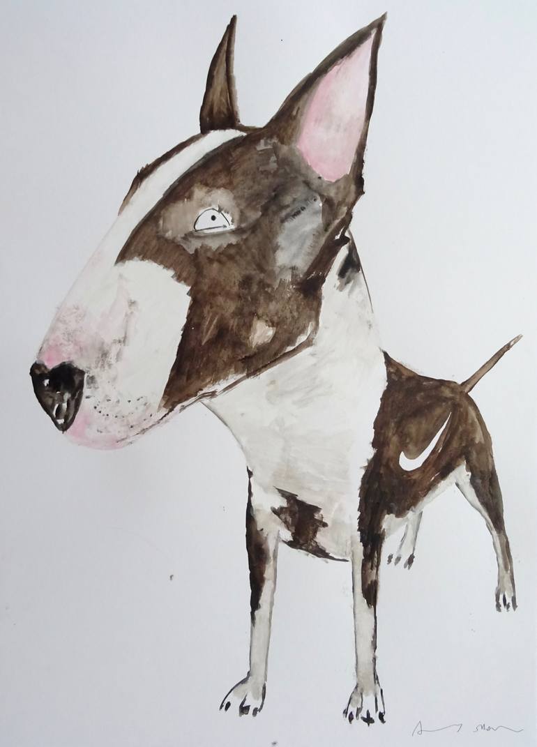 Bull Terrier Sporting Nike Swoosh Watercolour on paper 2018 Signed by Andy Shaw Ready for framing