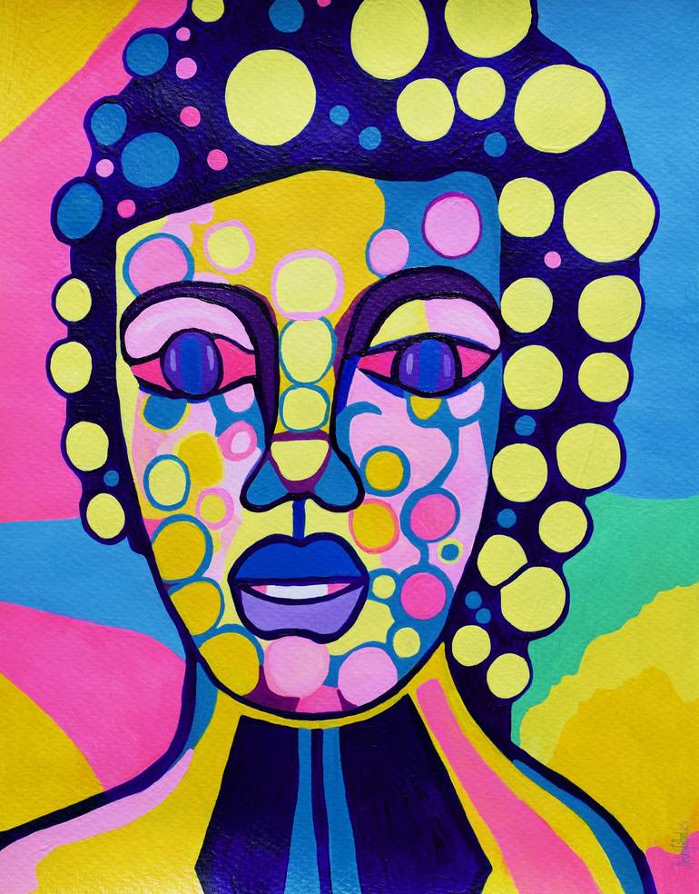 Acrylic painting.Woman with blue hair and bumpy dots of multiple sizes.
