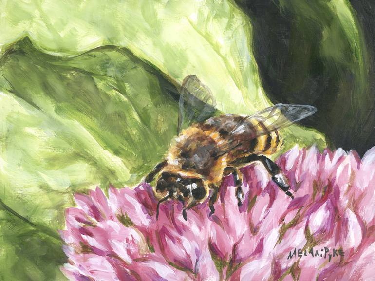 Celebrate the important work of bees with this realistic nature closeup of a bee gathering pollen from a sedum flower, painted with lovely bright pinks against green leaves in the background. - Acrylic -Painted on a 1" depth professional quality wood painting panel - Ready to hang, varnished.
