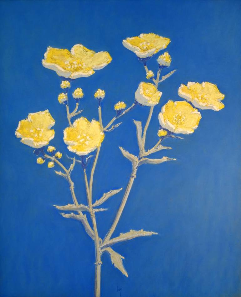 A buttercup plant by the side of a path. The vibrant flowers with their finely edged petals, the crowns of vibrant stamens in the sun, the buds just blooming, the beautiful supple stems punctuated with small leaves—a whole miniature and colorful festival that gives the path a festive air. The drawin...