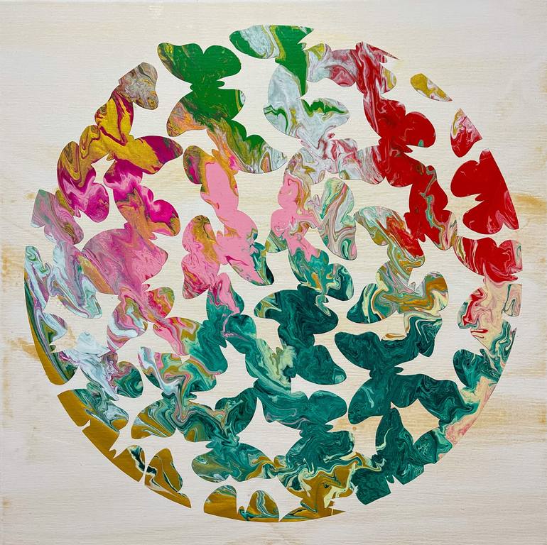 The artist was born in Nicosia, Cyprus (October 1987), where she currently lives and works. She holds a DNAP, (Diplôme National d’Arts Plastiques), from the Ecole Supérieure des Beaux-arts de Nîmes, as well as a DNAP and a DNSAP, (Diplôme National Supérieur d’Arts Plastiques), from the Ecole Nationale Supérieure des Beaux-arts de Paris, France, obtained with Distinction. Eleni Pratsi produces artworks with geometric compositions and explosive, liquescent colours. She utilises both painting and printmaking techniques, evoking a balance between creative control and affirmation of chance, which extends throughout all the works. Every composition is created from experimentation with different colour combinations and the infinite possibilities that surface through the repetition, overlap and juxtaposition of circles. The use of stencil, a meticulously cut-out original which meets the canvas, creates sometimes sealed, and other times porous boundaries for the vivid colours that are poured directly on it. The colour palette is influenced by pop culture, developments in pigments and industrial paint production, which Pratsi continually researches. The paint, whose density is specific but different every time, interacts within the in-between space of canvas and stencil in ways that are often surprising. The specifics of gravity, which carries the paint on the painterly surface, play an important part in the creation of colour drips and blocks. Having developed a special relationship to the materiality of painting and the multiplicity of printmaking, Pratsi proposes images that do not impose a fixed meaning but invite the eye to travel within otherworldly landscapes, seen as if from above. The visual and emotional connections one can make, lead to different interpretations of the works. The title of the exhibition, “La Vie en Ronde”, can be interpreted to refer to the “roundness” of life, that feeling of things being mysteriously tied to each other, turning on their own accord, flowing, mixing, and mingling on endless horizons. Evagoras Vanezis Art Theorist