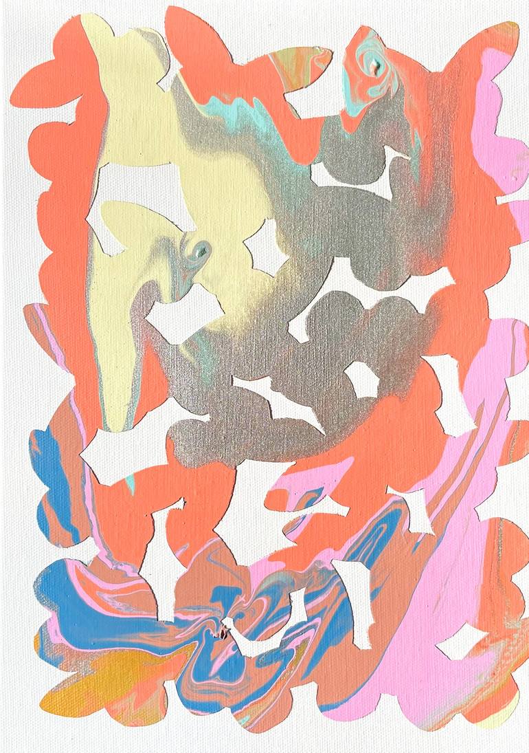 The artist was born in Nicosia, Cyprus (October 1987), where she currently lives and works. She holds a DNAP, (Diplôme National d’Arts Plastiques), from the Ecole Supérieure des Beaux-arts de Nîmes, as well as a DNAP and a DNSAP, (Diplôme National Supérieur d’Arts Plastiques), from the Ecole Nationale Supérieure des Beaux-arts de Paris, France, obtained with Distinction. Eleni Pratsi produces artworks with geometric compositions and explosive, liquescent colours. She utilises both painting and printmaking techniques, evoking a balance between creative control and affirmation of chance, which extends throughout all the works. Every composition is created from experimentation with different colour combinations and the infinite possibilities that surface through the repetition, overlap and juxtaposition of circles. The use of stencil, a meticulously cut-out original which meets the canvas, creates sometimes sealed, and other times porous boundaries for the vivid colours that are poured directly on it. The colour palette is influenced by pop culture, developments in pigments and industrial paint production, which Pratsi continually researches. The paint, whose density is specific but different every time, interacts within the in-between space of canvas and stencil in ways that are often surprising. The specifics of gravity, which carries the paint on the painterly surface, play an important part in the creation of colour drips and blocks. Having developed a special relationship to the materiality of painting and the multiplicity of printmaking, Pratsi proposes images that do not impose a fixed meaning but invite the eye to travel within otherworldly landscapes, seen as if from above. The visual and emotional connections one can make, lead to different interpretations of the works. The title of the exhibition, “La Vie en Ronde”, can be interpreted to refer to the “roundness” of life, that feeling of things being mysteriously tied to each other, turning on their own accord, flowing, mixing, and mingling on endless horizons. Evagoras Vanezis Art Theorist