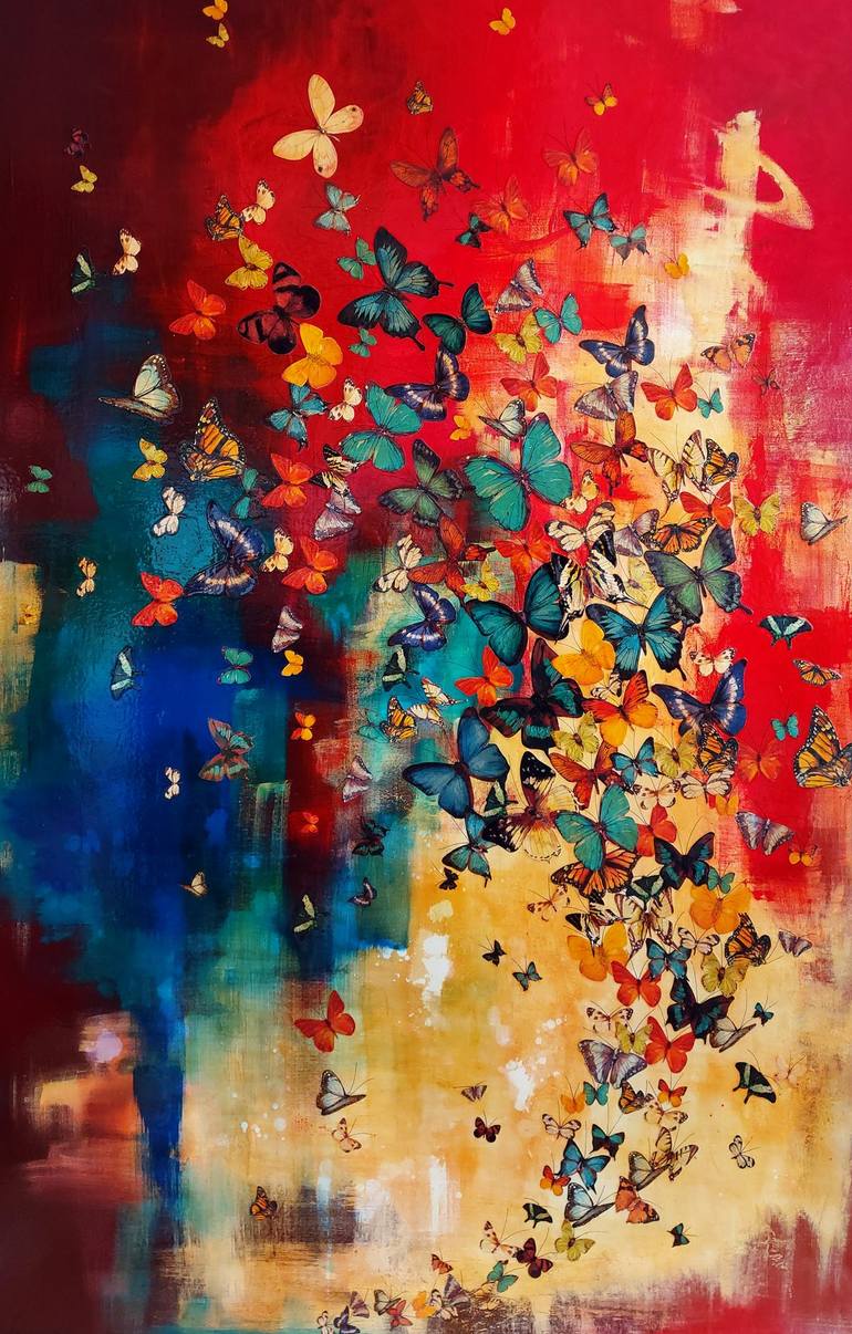 The upward flow of butterflies embodies energy, vitality, positivity, and joy. The butterflies are set to a background of deep crimson, blues, ochre and pale neutrals, with washes of burnt sienna inks. Lily aims for her colour palettes to be vibrant without being garish. This canvas is intended to b...