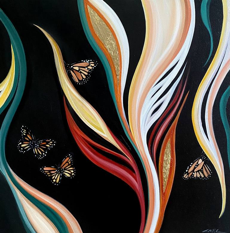Like a monarch butterfly emerging from its chrysalis, this original oil painting on canvas, titled "Butterflies," embodies transformation and hope. Bright colors dance against a dramatic black backdrop, creating a dreamy and whimsical effect. The artist's abstract expressionism style captures the be...