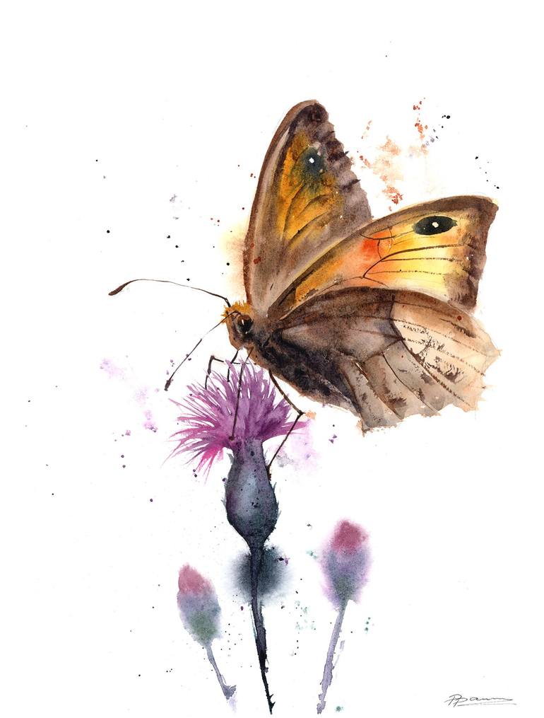 This butterfly on the thistle is painted in soft and expressive style watercolor; using dry on wet technique to lay the base wash first and then fine details added later - resulting in an expressive and atmospheric painting portraying this beautiful light propagating through the wings of a small ins...