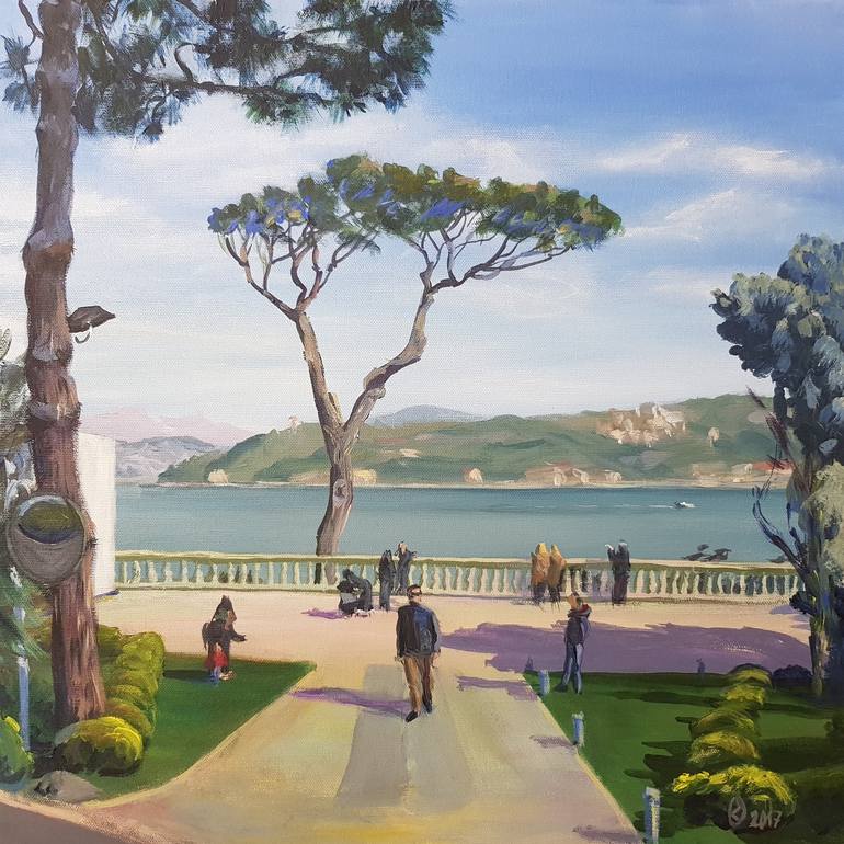 It is a square shaped (45x45cm) acrylic work on a framed canvas. Made in the studio after visiting one of Istanbul museums with a small park facing the Bosphorus on a windy spring day.