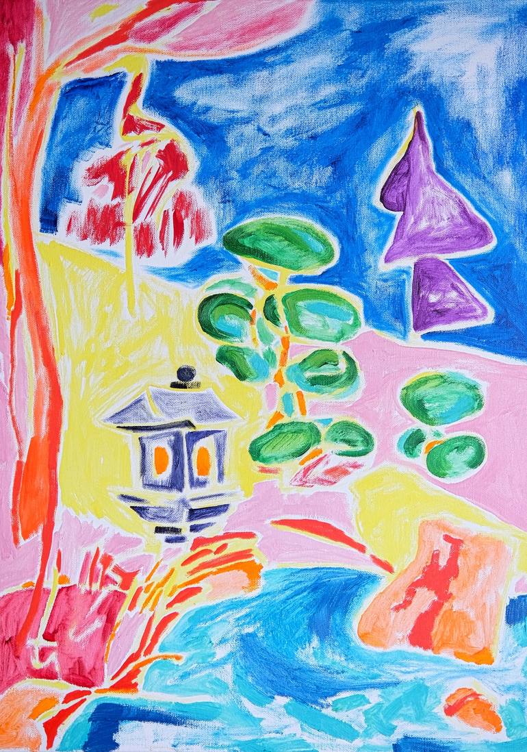 By The Pond is Tamara Jare contemporary landscape painting. Pond with blue water, Japanese lamp, trees, nature, meditation, zen, relax.