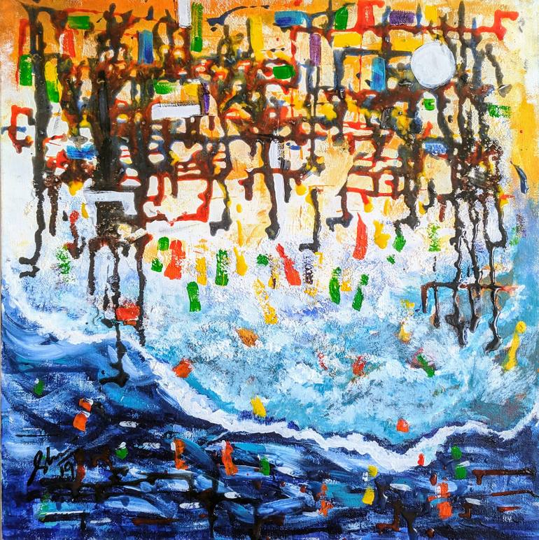 In this painting, I have tried to get a vibration and movement in terms of color, form and light. I have used various free flowing mediums to attain this visual rhythm and sensibilities of a clustered city. This was made on a stretched canvas but not framed. It has got hooks at the back ready to ha...